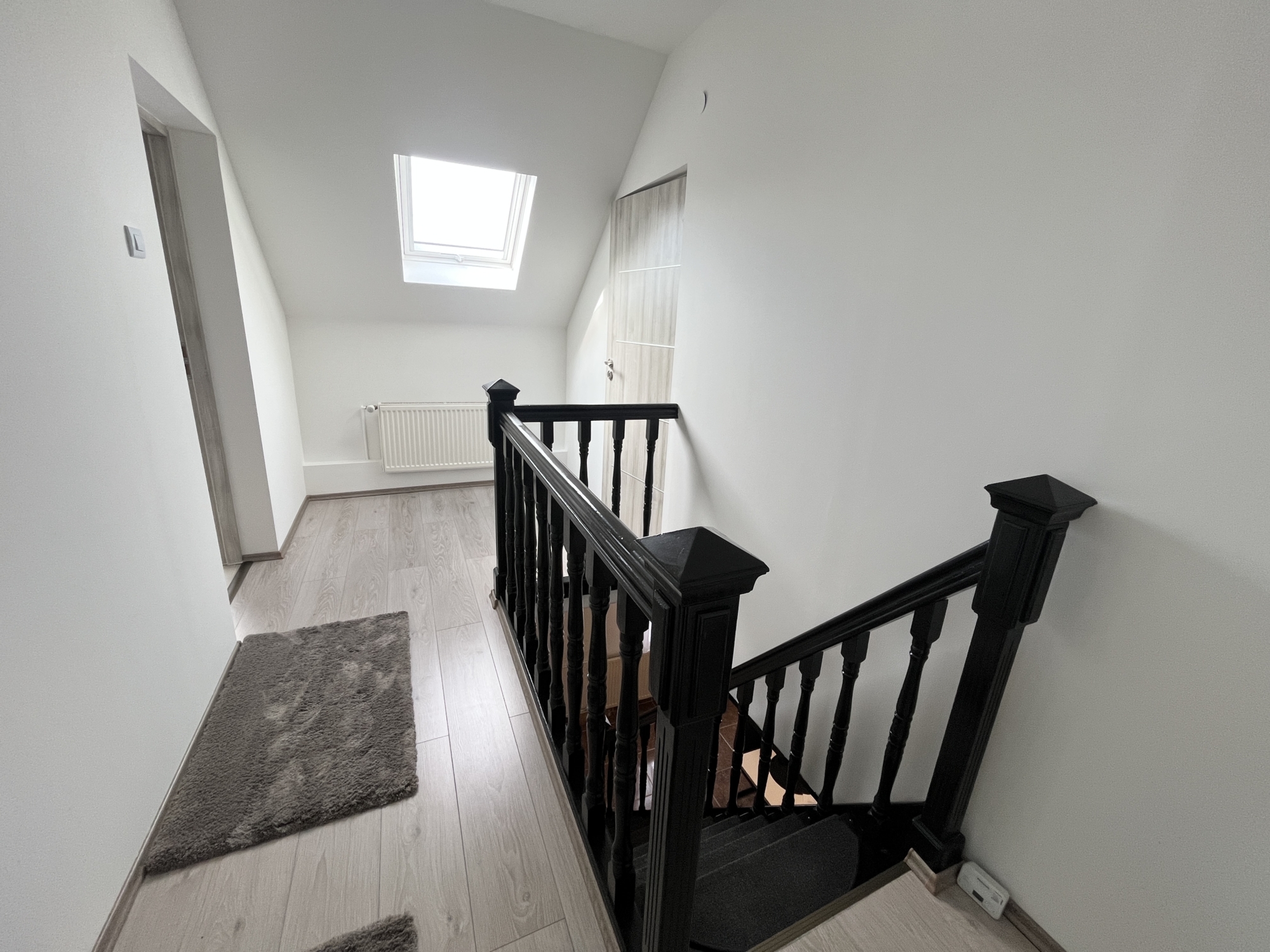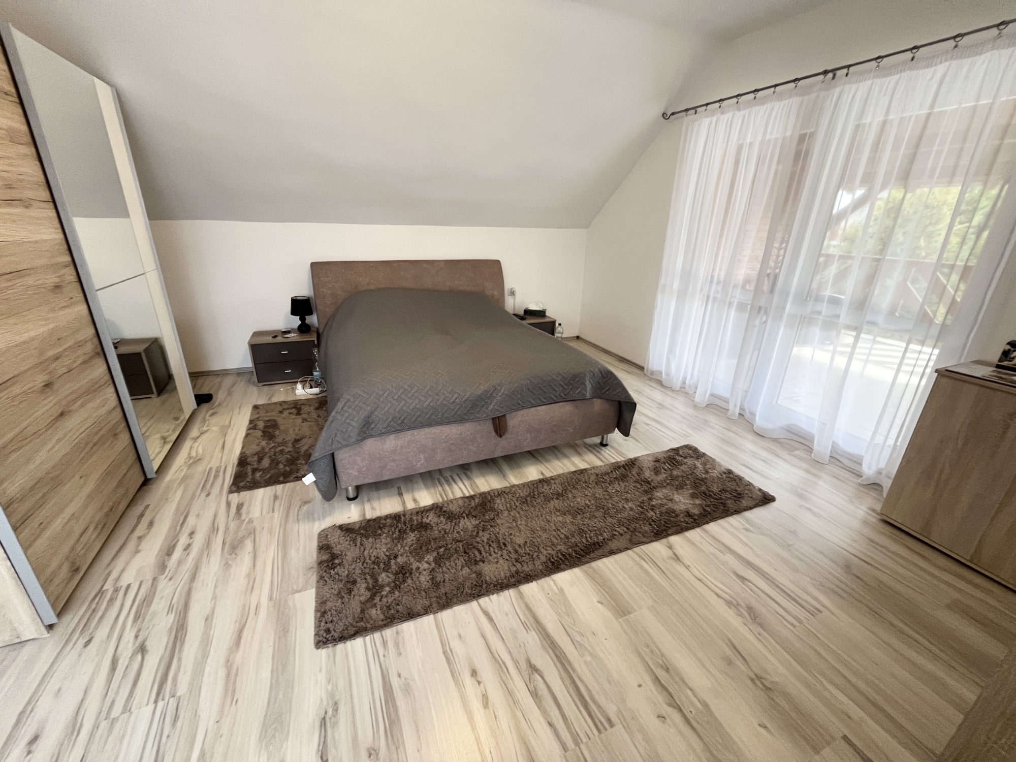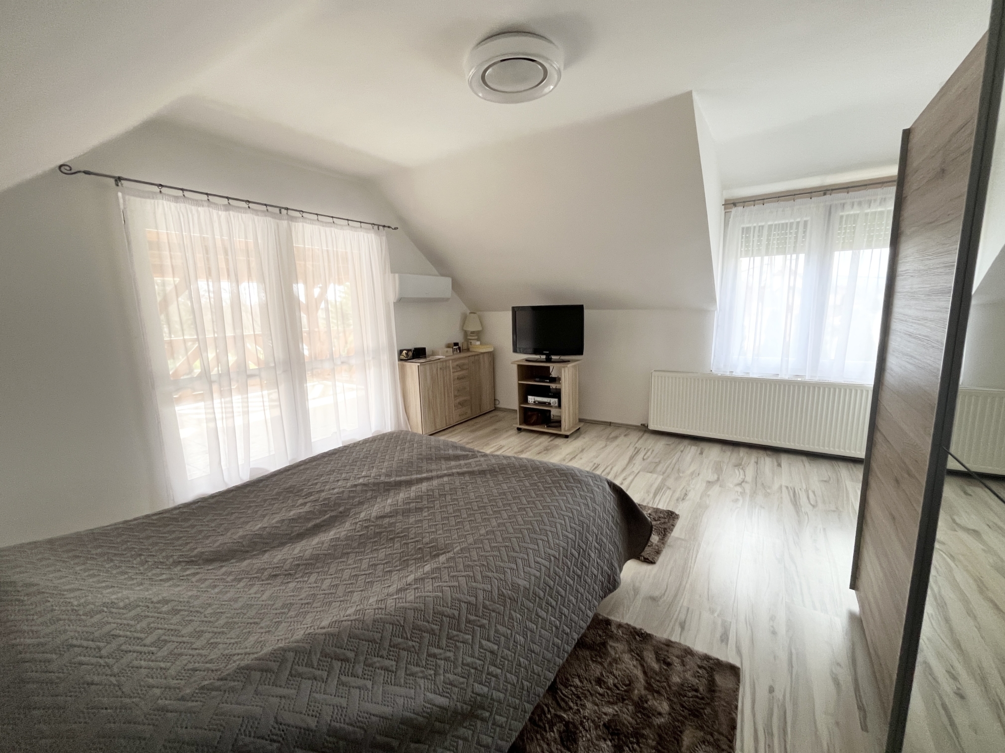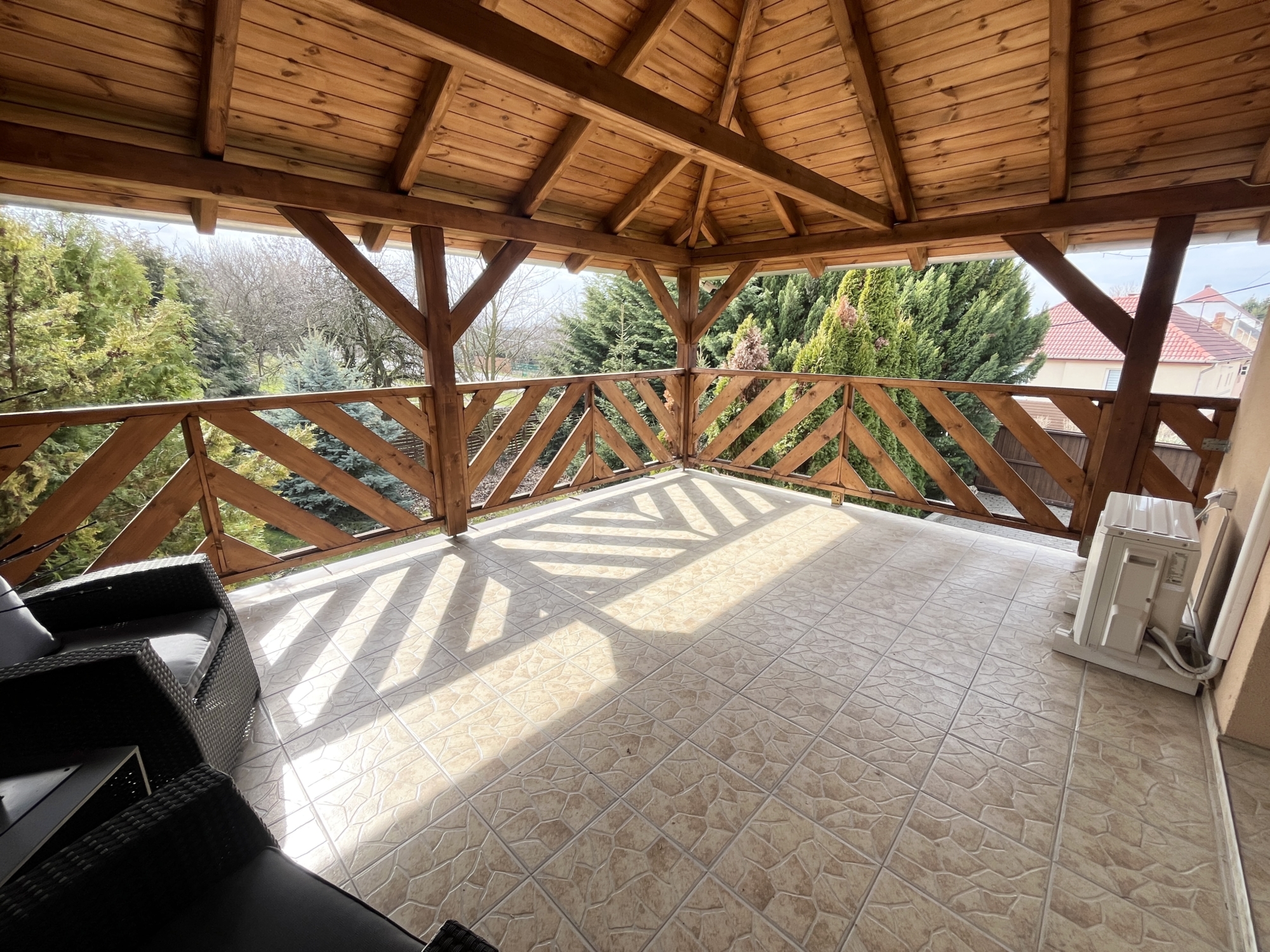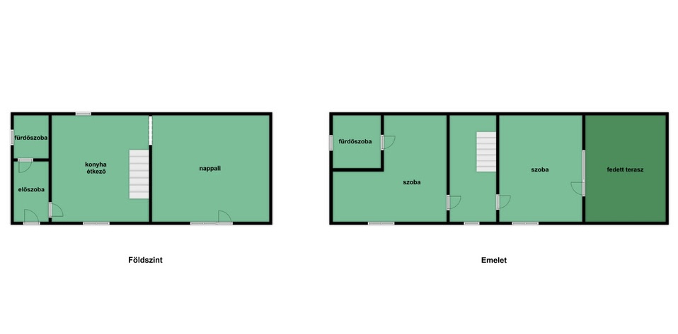 Az emeleten: közlekedő, kettő szoba, fürdőszoba. Innen nyílik egy nagy méretű fedett terasz is.