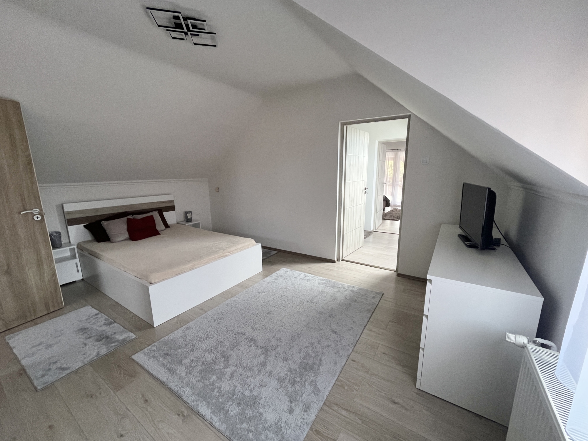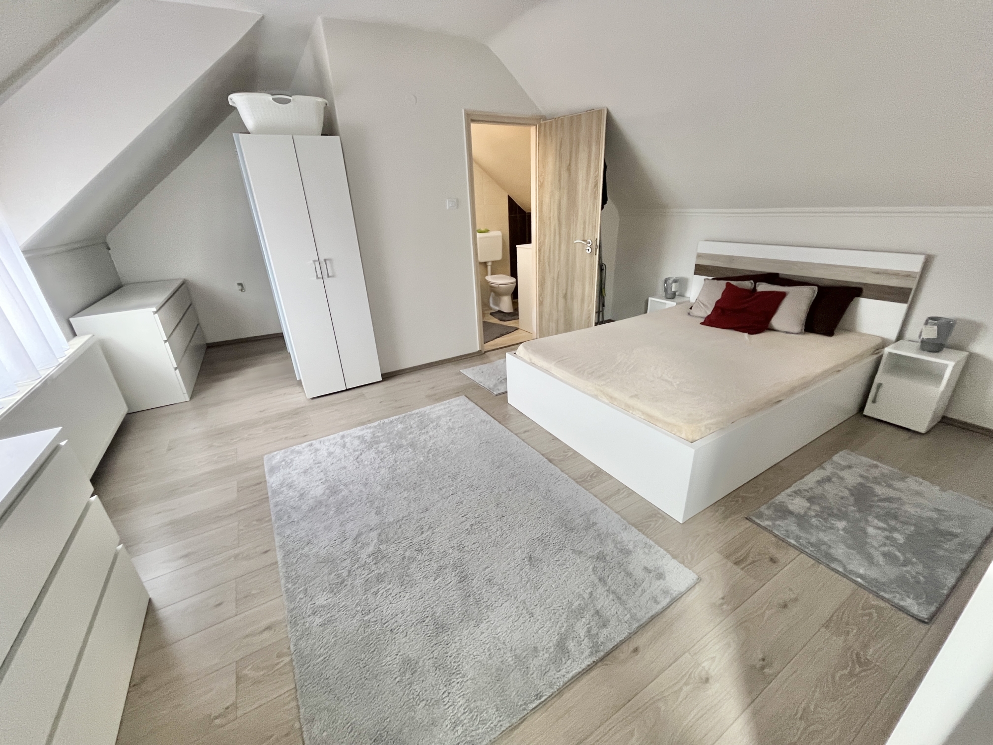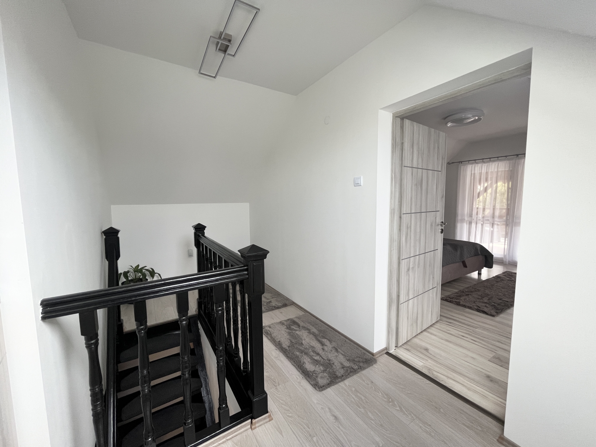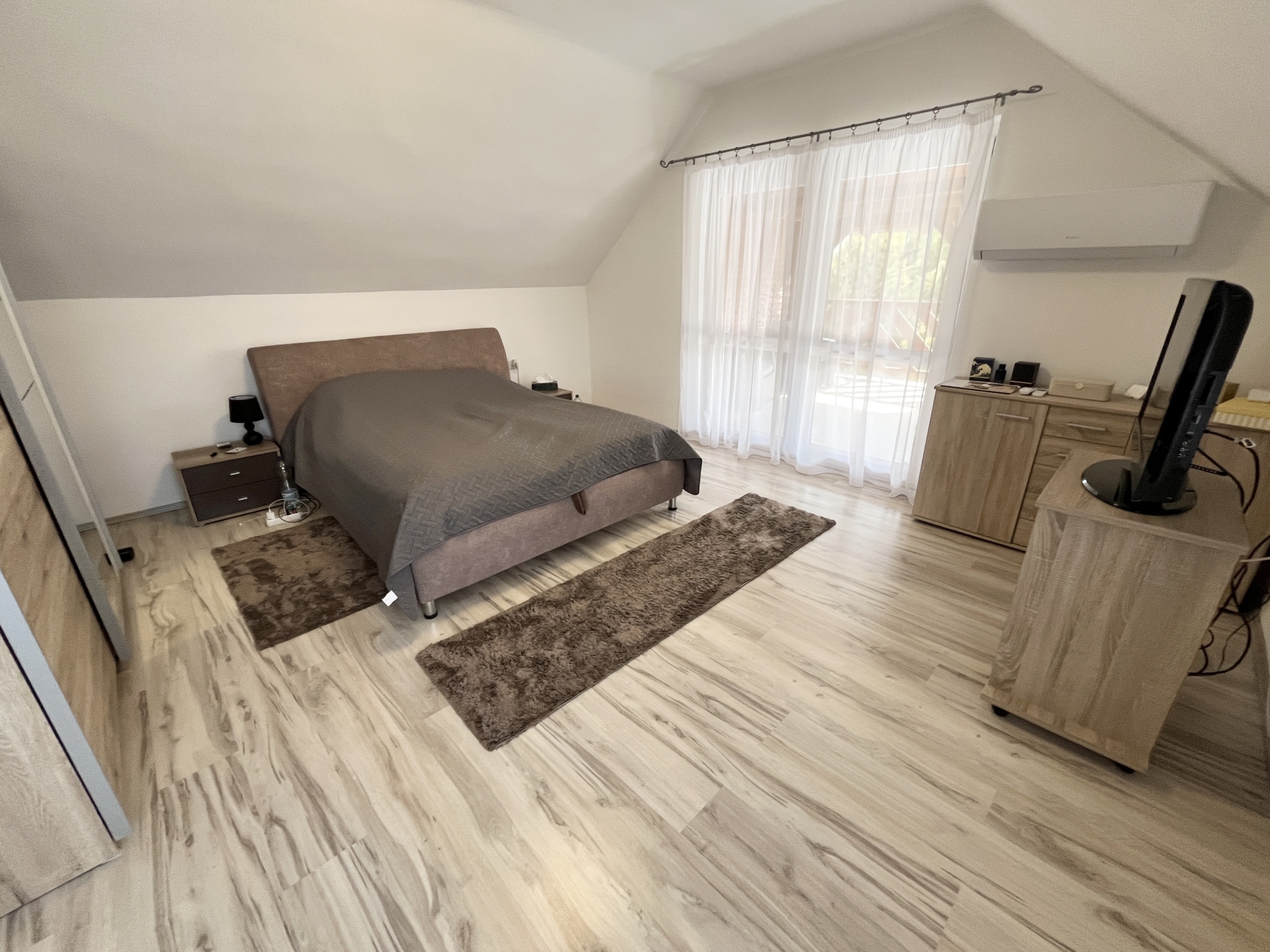 Az emeleten: közlekedő, kettő szoba, fürdőszoba. Innen nyílik egy nagy méretű fedett terasz is.