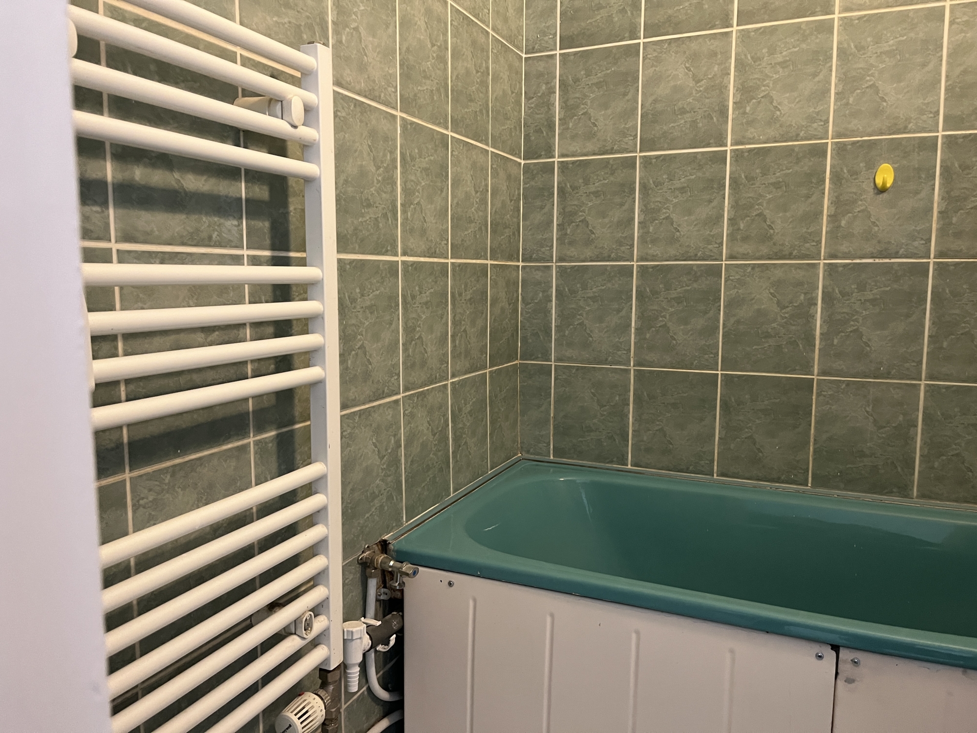 A fürdőszoba szintén járólappal és csempével burkolt, melyben kád van elhelyezve.