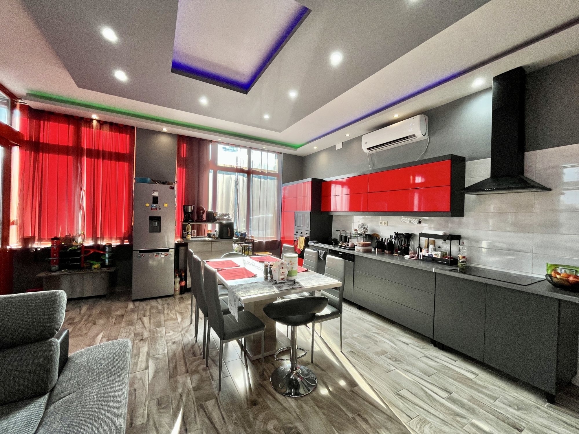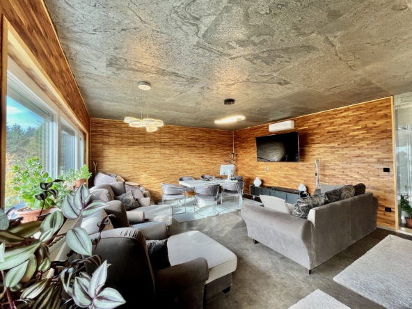 Az alsó szinten 4 háló, nappali, konyha-étkező, 2 fürdős WC került kialakításra. A nappaliból nyílik egy 40 m² terasz.
