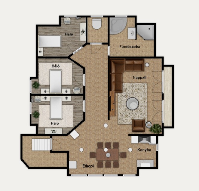 A felső szinten 3 háló, nappali, konyha-étkező, fürdőszoba-WC található.