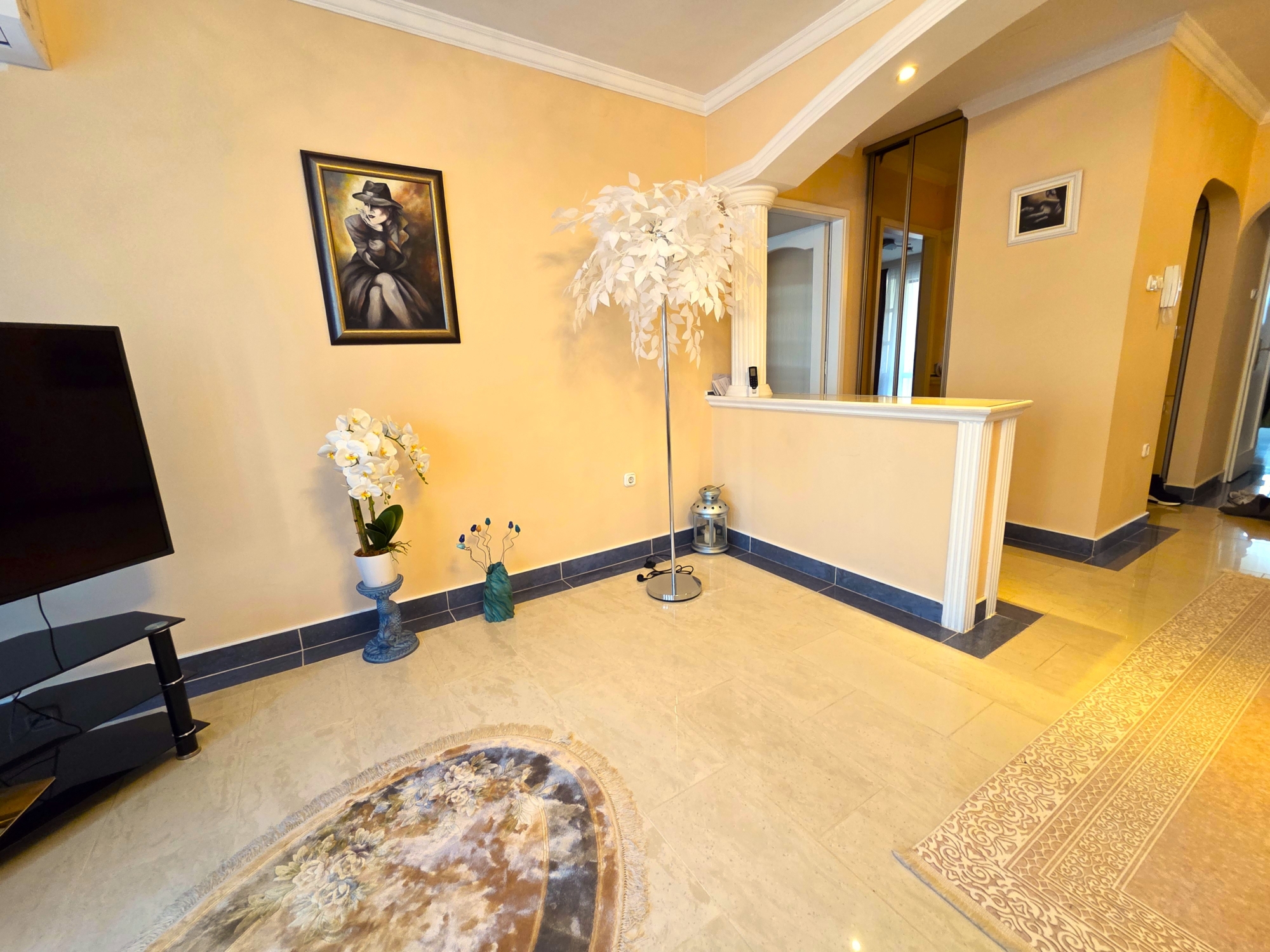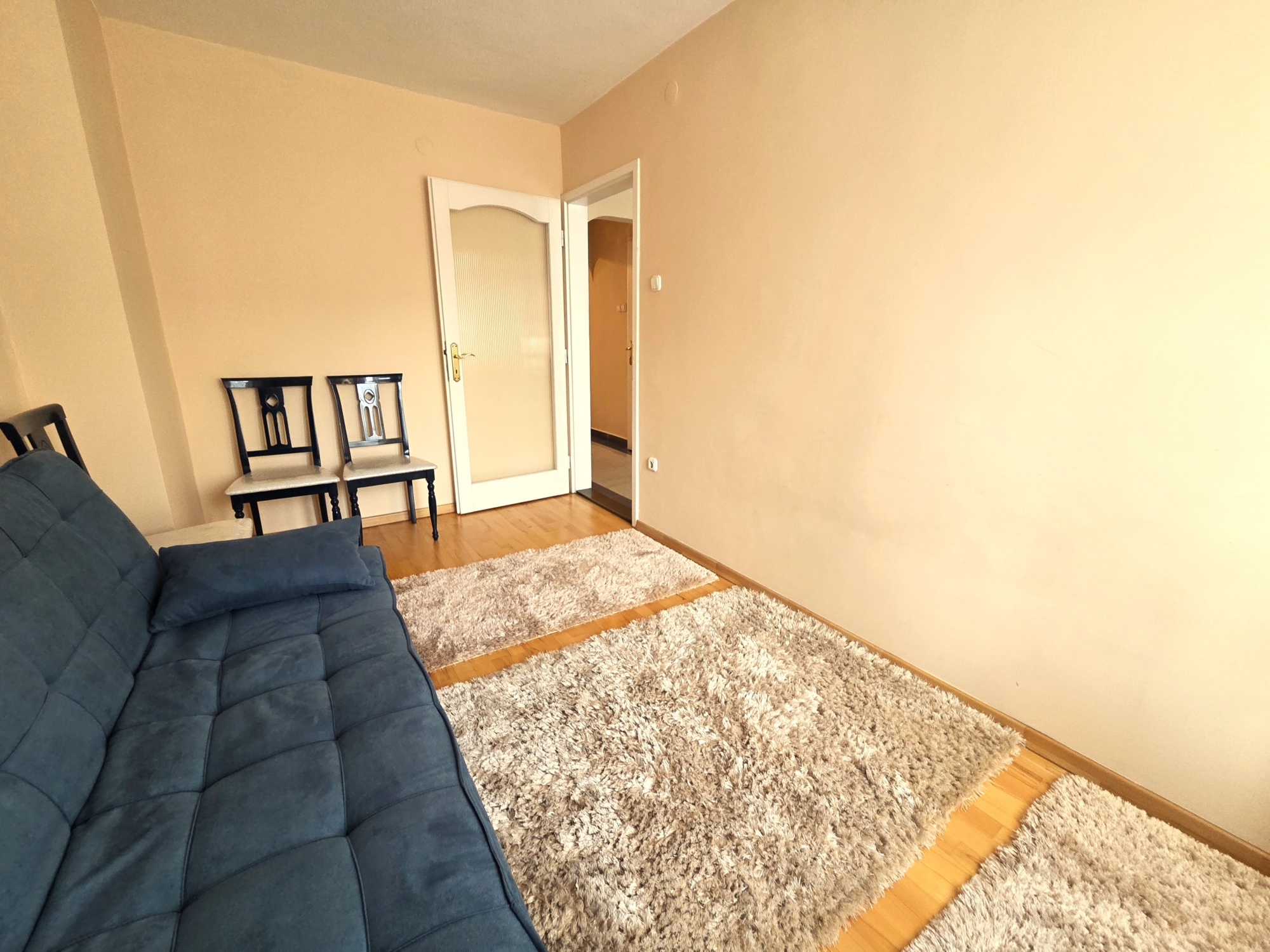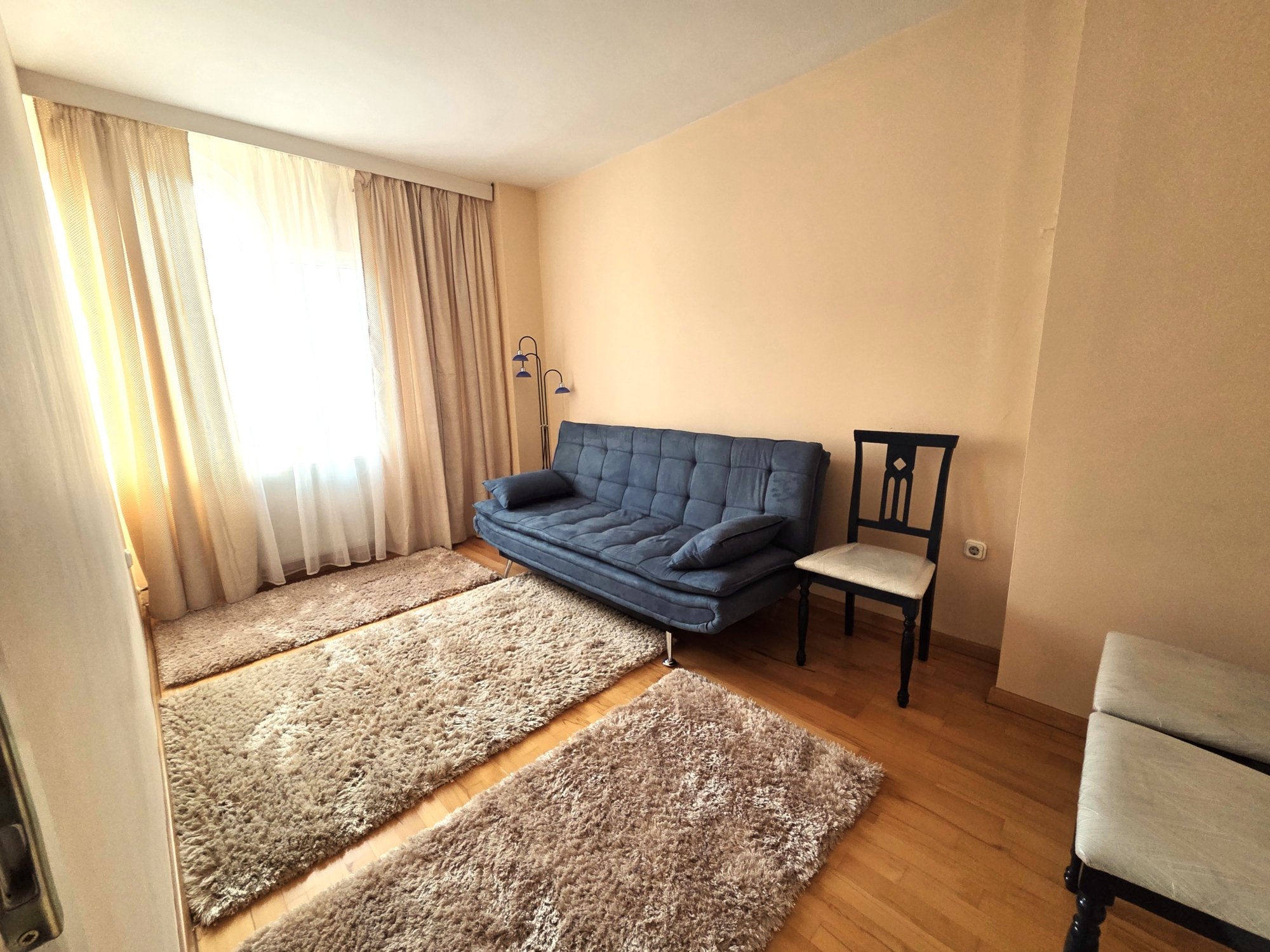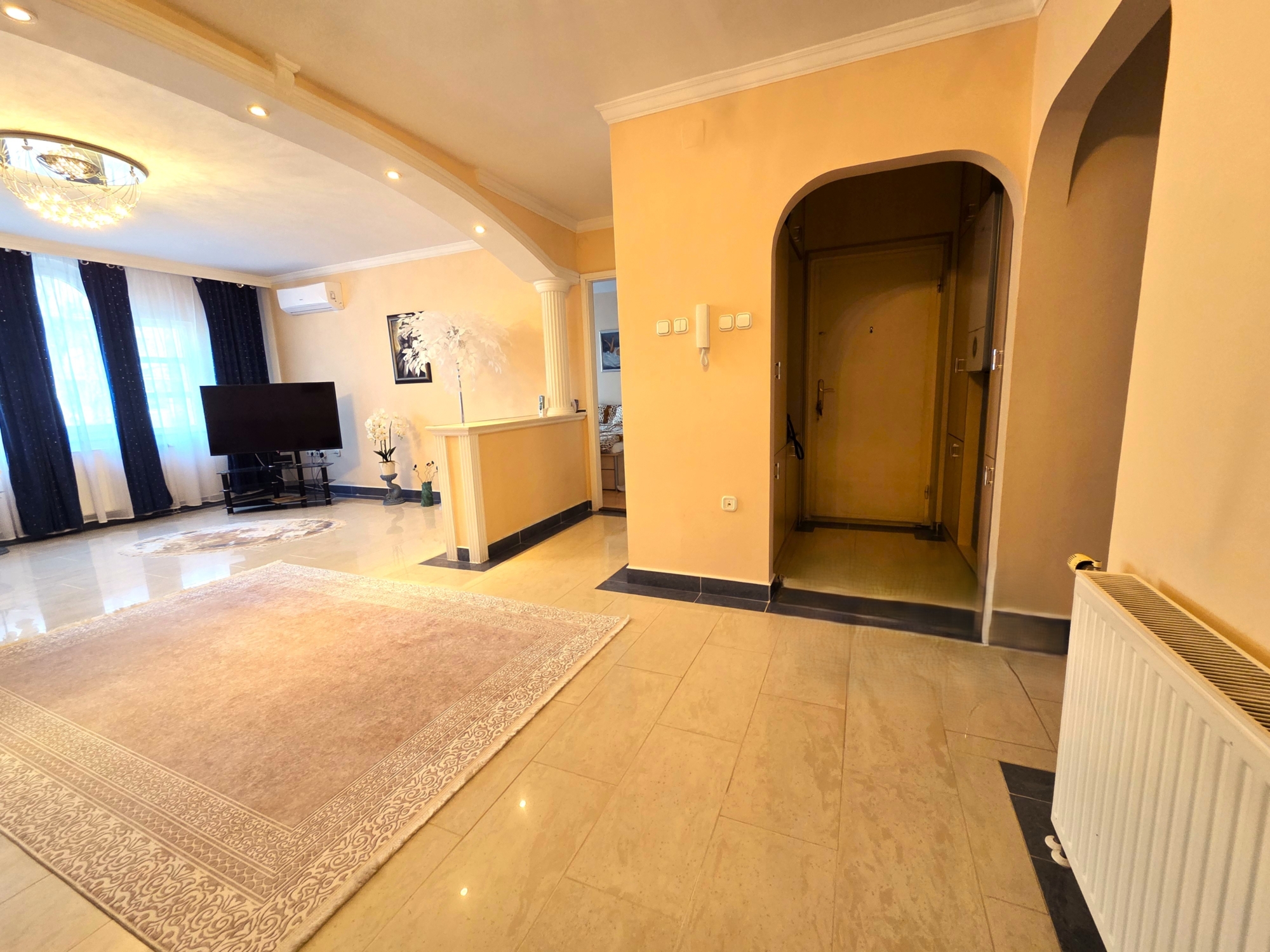 A lakásba lépve egy tágas, napfényes nappali fogad, amelyet a hatalmas ablakok tesznek különlegesen világossá.