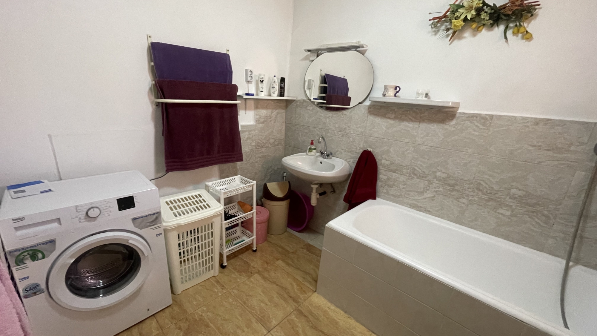 A fürdőszoba felújított, ízléses burkolatokkal és korszerű szaniterekkel
