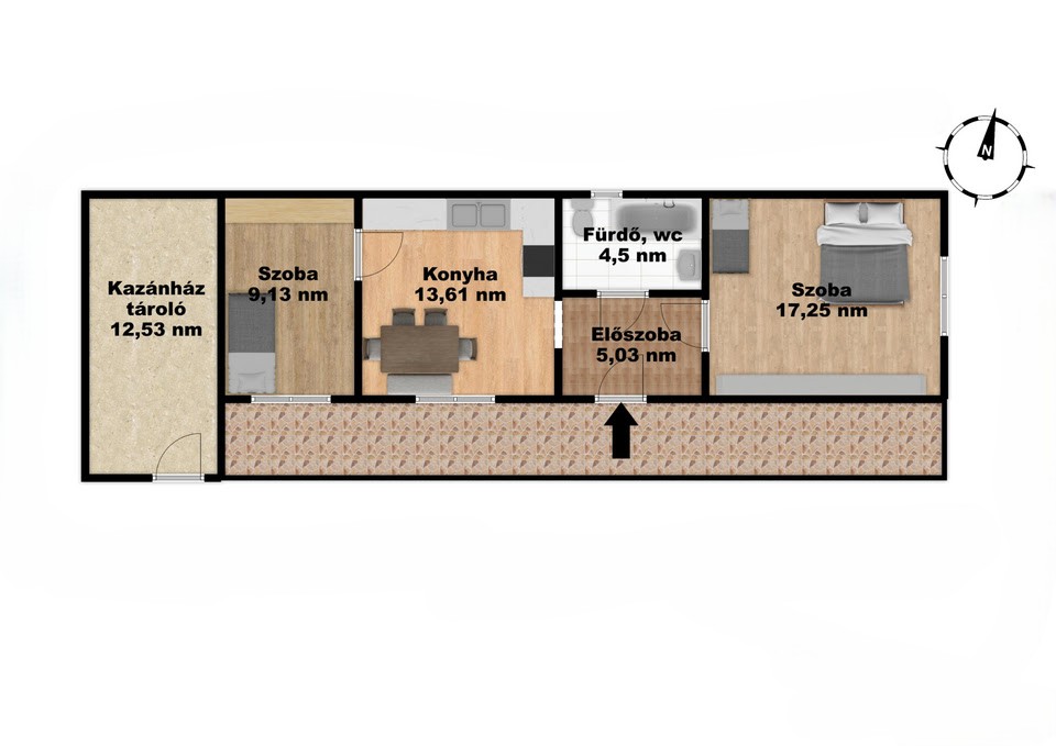 Melléképületek: a ház mögött kazánház és tároló, udvaron 9,78 nm nyári konyha