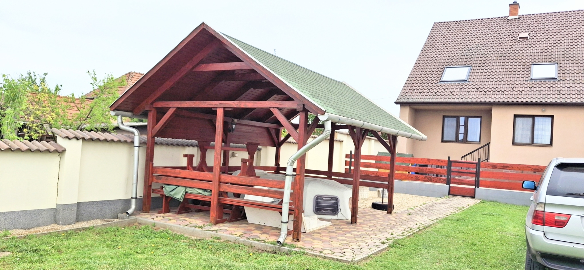A térkövezett udvaron található egy filagória, szalonnasütő, valamint egy elektromos kapuval ellátott, 2 autó kényelmes parkolására alkalmas dupla garázs is.