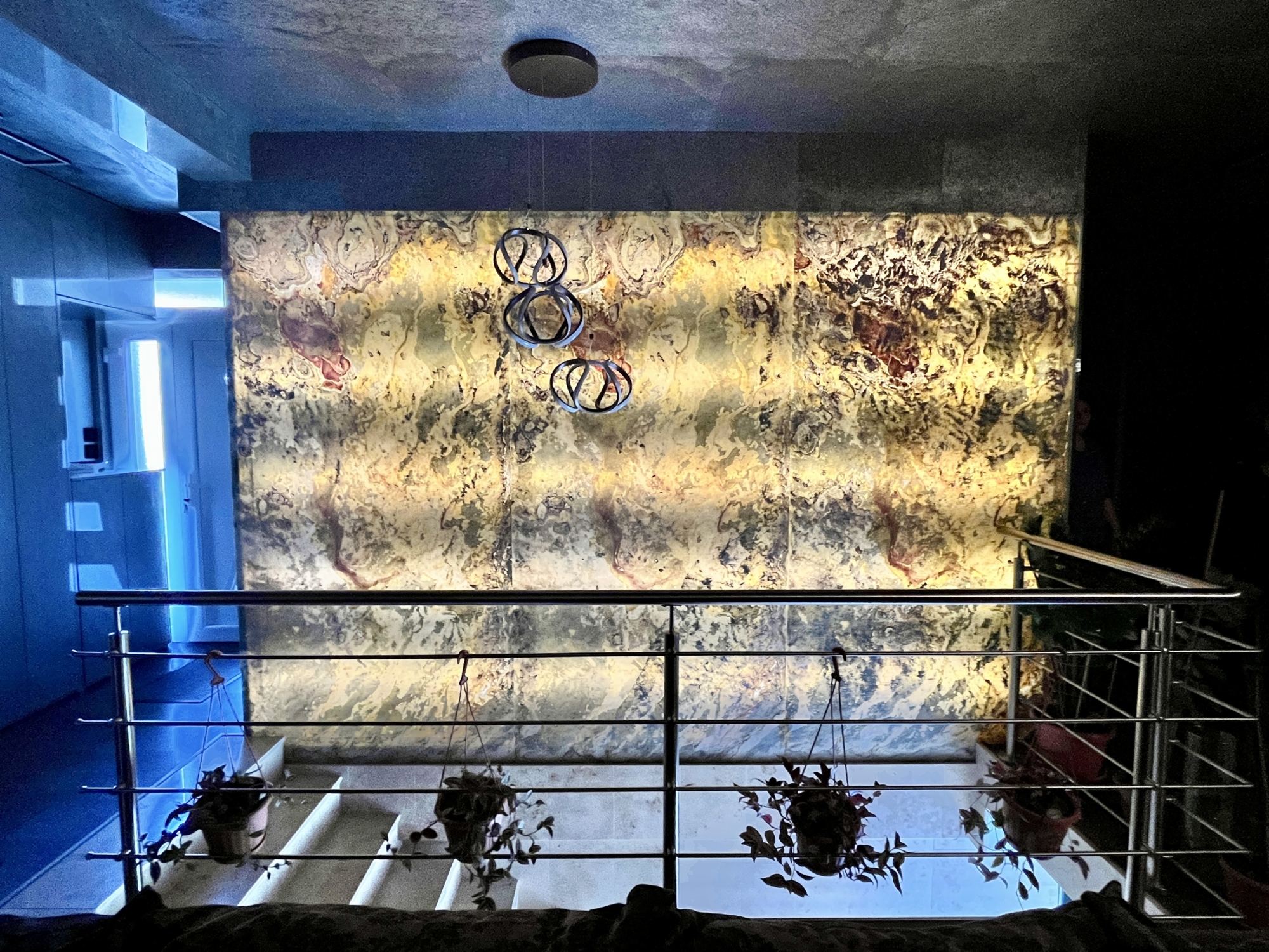 Természetes faburkolatok, mennyezeti és falburkolatok kőfurnérból, LED-háttérvilágítással