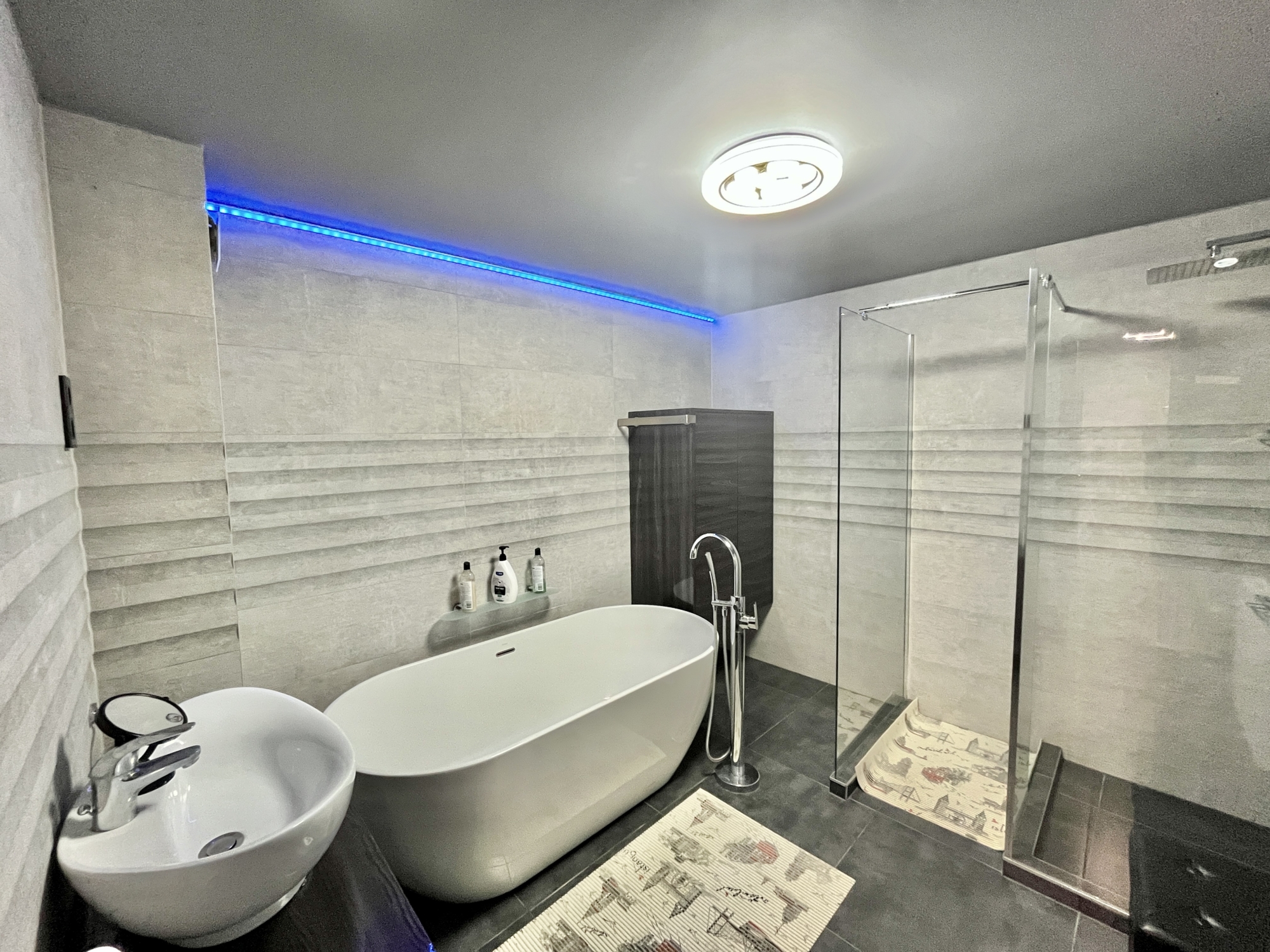 Luxus fürdőszobában Rawak szaniterek kerülte beépítésre, szabadon álló kád, esőztető zuhany, beépített mosdó.