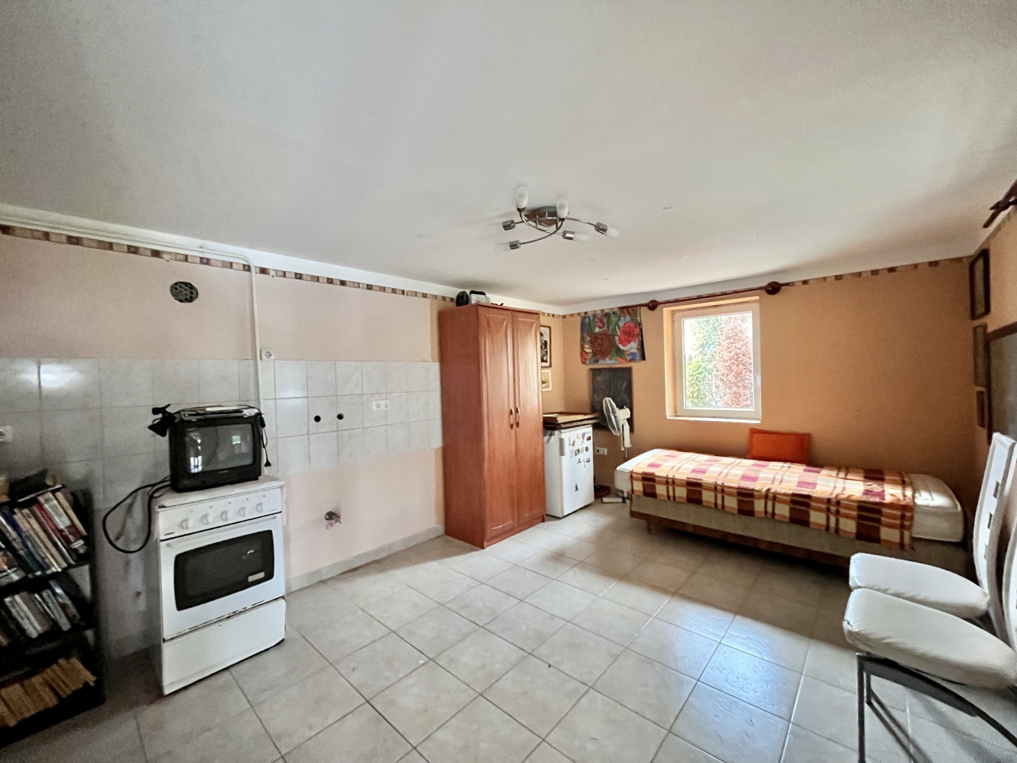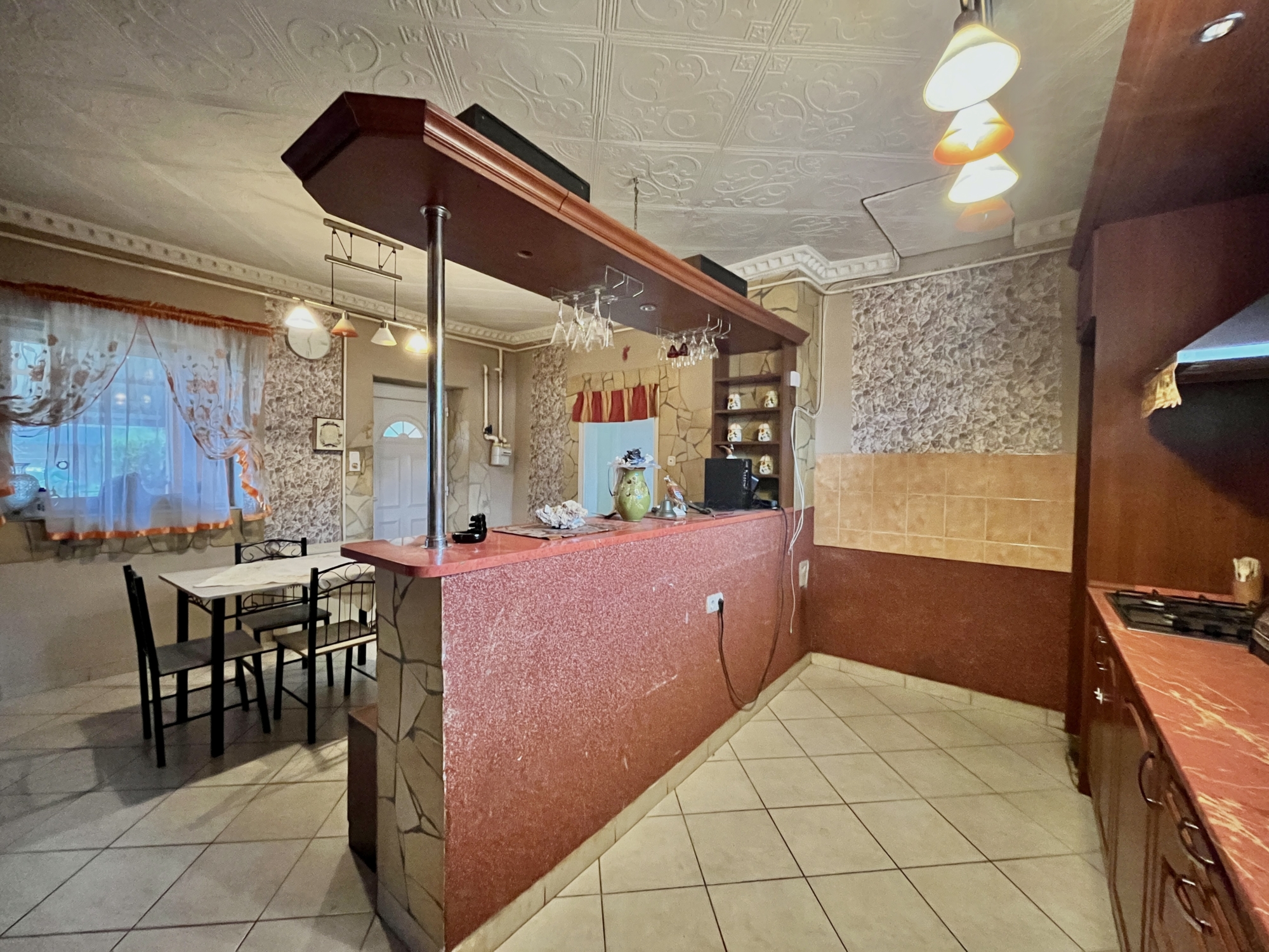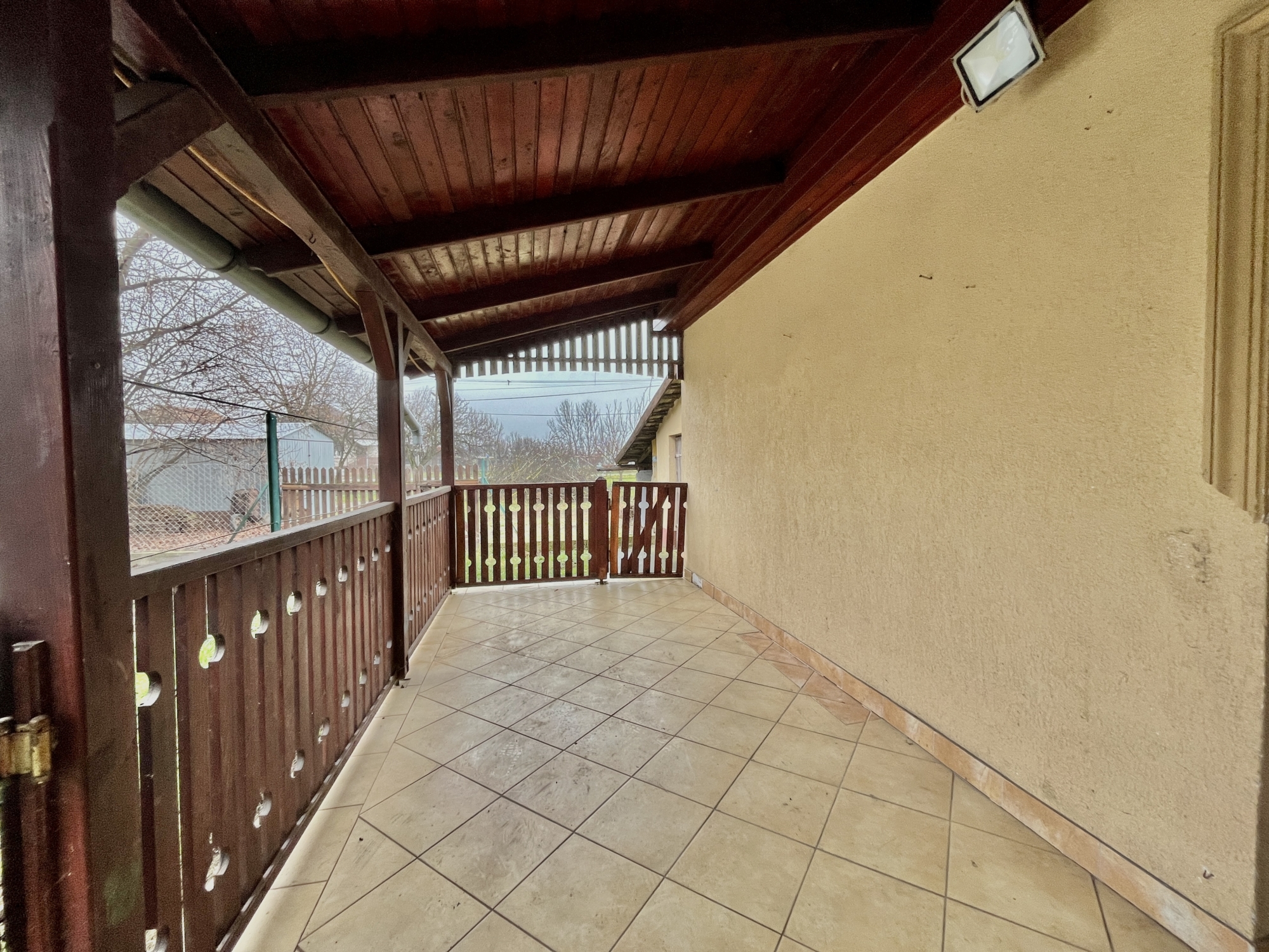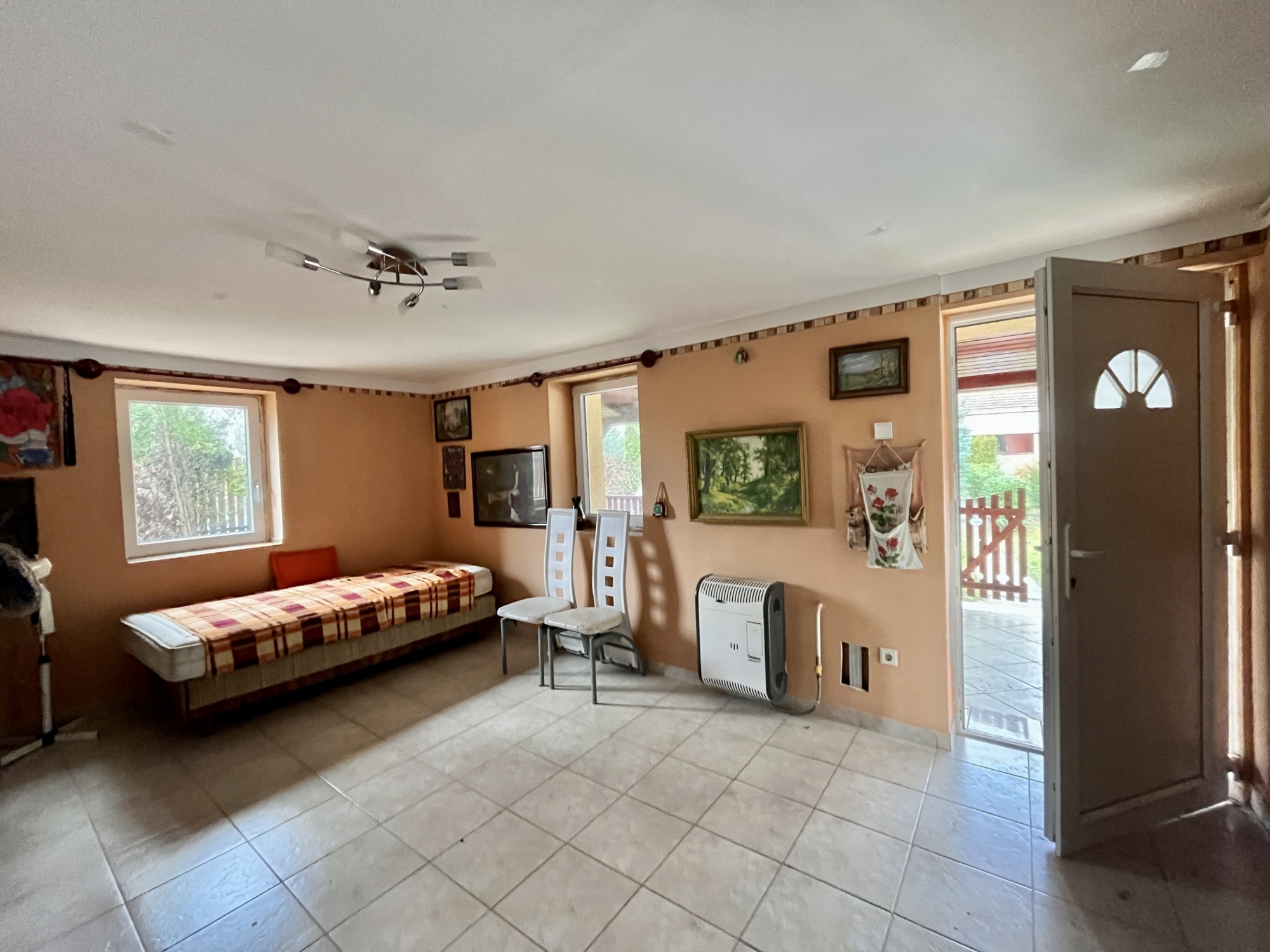 A ingatlan közművesített műanyag nyílászárokkal felszerelt. A ház egy hálószobából vendégszobából,illetve egy amerikai stílusú konyhából áll. A konyha kettéválasztott egy bárpult segítsésével, így hangulatosabb. Található benne még egy fürdő ,ami a vendégszobából közelíthető meg.
